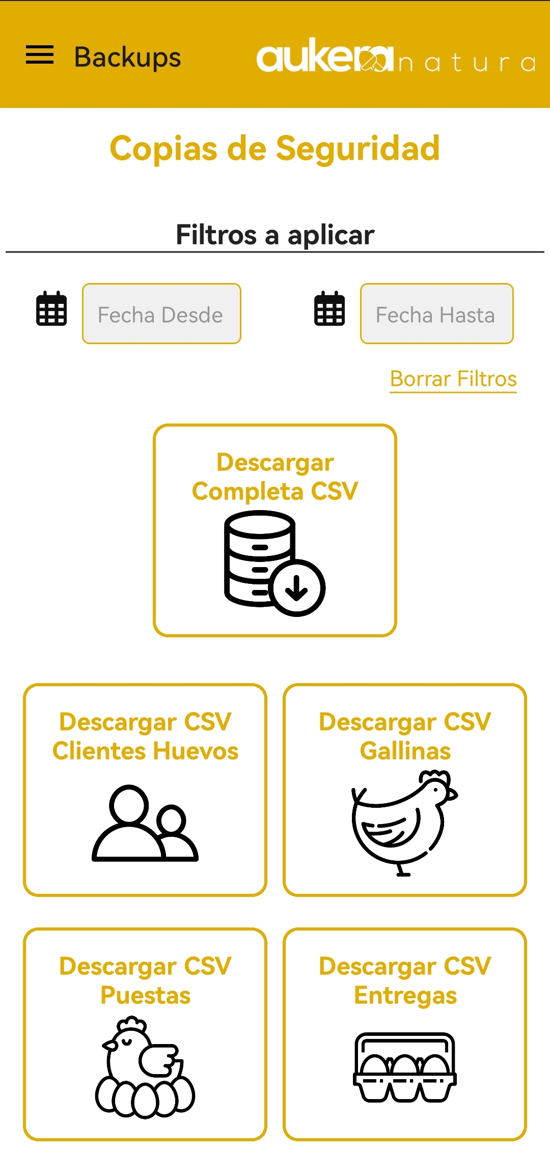Desde esta sección se puede descargar en formato .csv la información almacenada de las distintas funcionalidades de la APP.