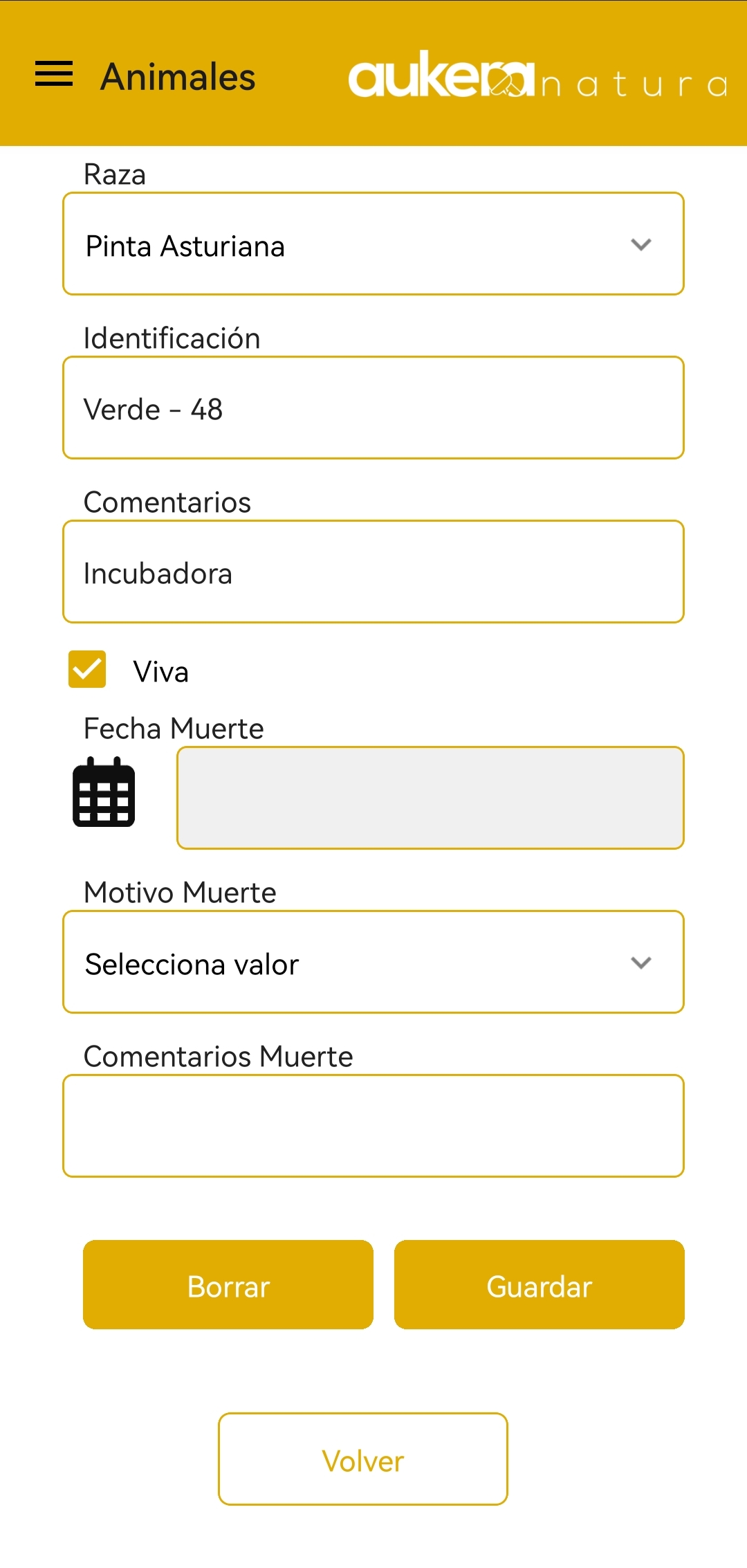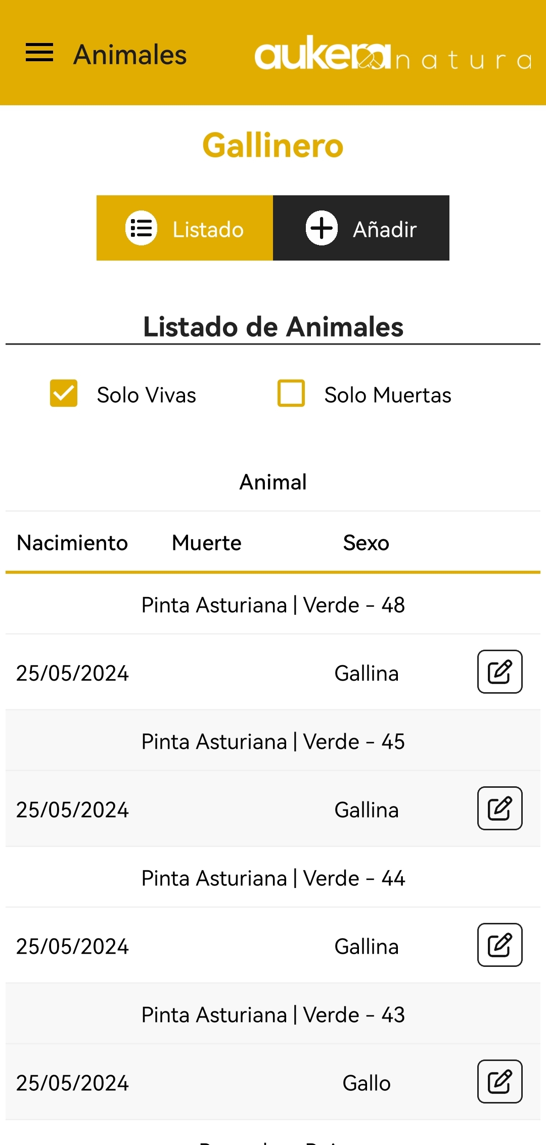 Podrás ver el listado de los animales (pudiendo filtrar por vivas o muertas) y en cada uno de los animales podrás acceder a la acción de "Editar animal".