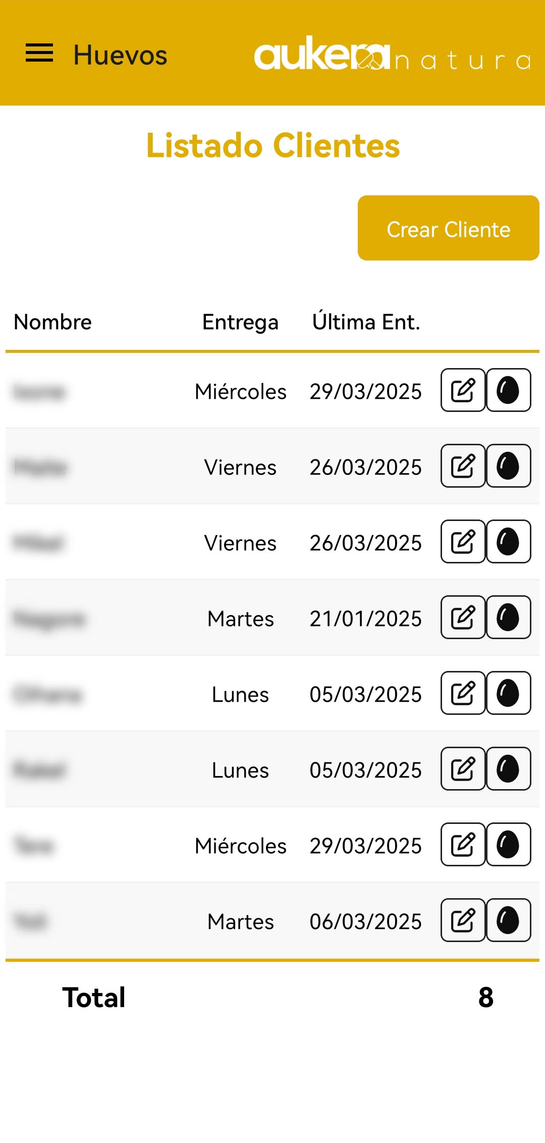 Lo primero es registrar los clientes. Una vez creado tendrás un listado de los clientes pudiendo editar o gestionar sus entregas (los iconos que hay junto con la fecha de la última entrega).