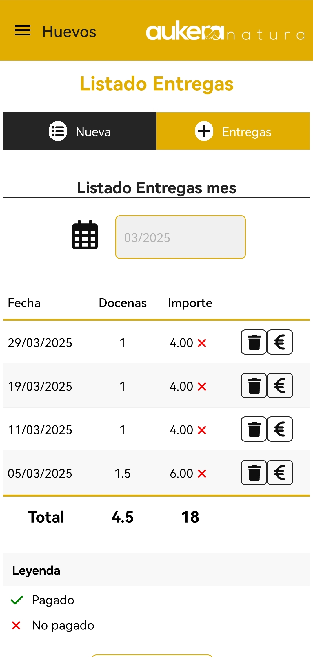 En el listado de entregas podrás ver de forma fácil las entregas realizadas al cliente en cuestión teniendo las acciones de "Eliminar entrega" o "Marcar o Desmarcar la entrega como pagada".