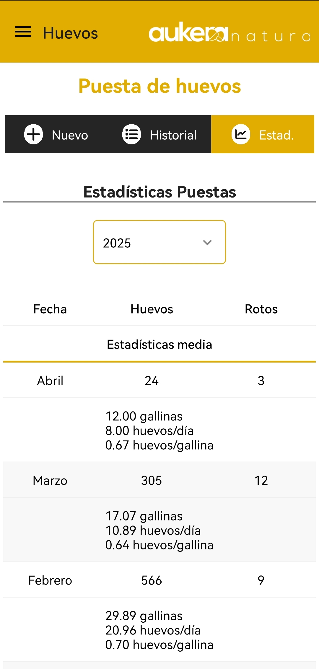 En Estadísticas podrás ver la evolución de las puestas de huevos durante todo un año.