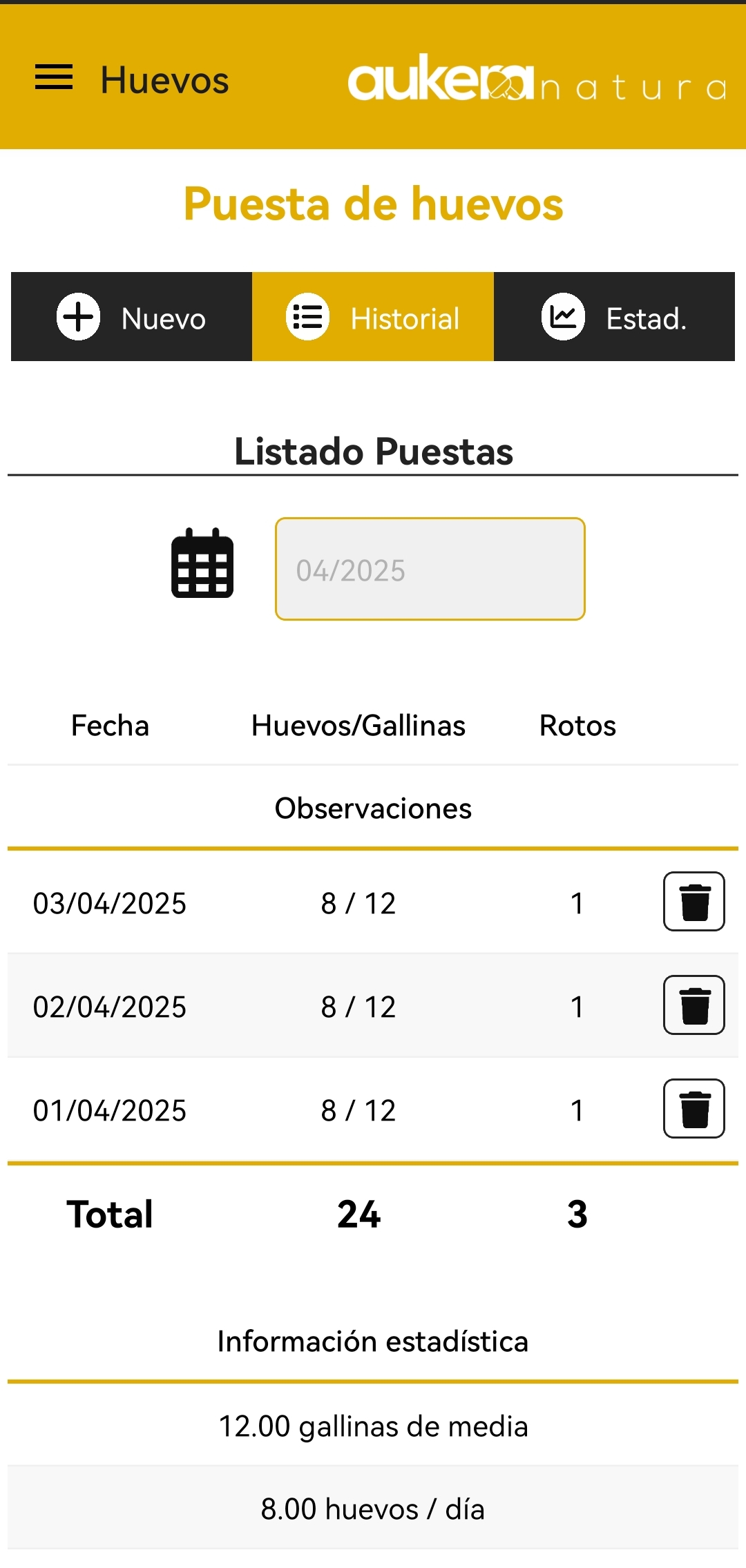 En el apartado Historial podrás ver el total de huevos puestos durante el mes seleccionado.
