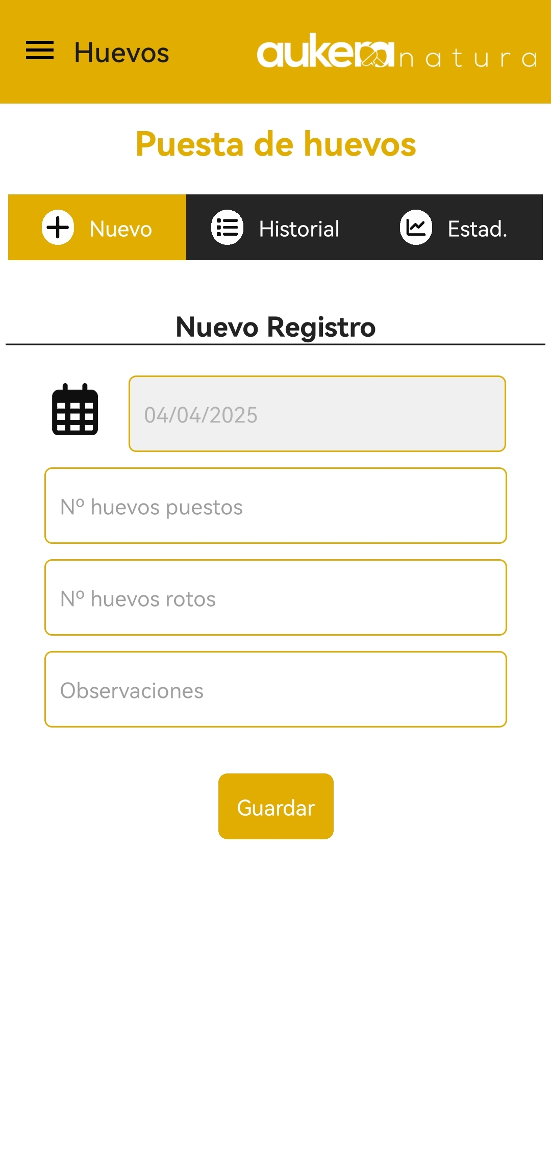 Al añadir una nueva puesta podrás incluir el día de la puesta, el número de huevos, así como los que se han encontrado rotos y observaciones si fuera necesario.