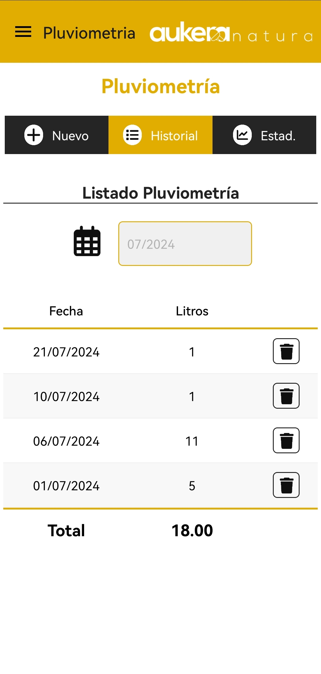 En el apartado Historial podrás ver el total de litros de agua que ha llovido durante el mes seleccionado.