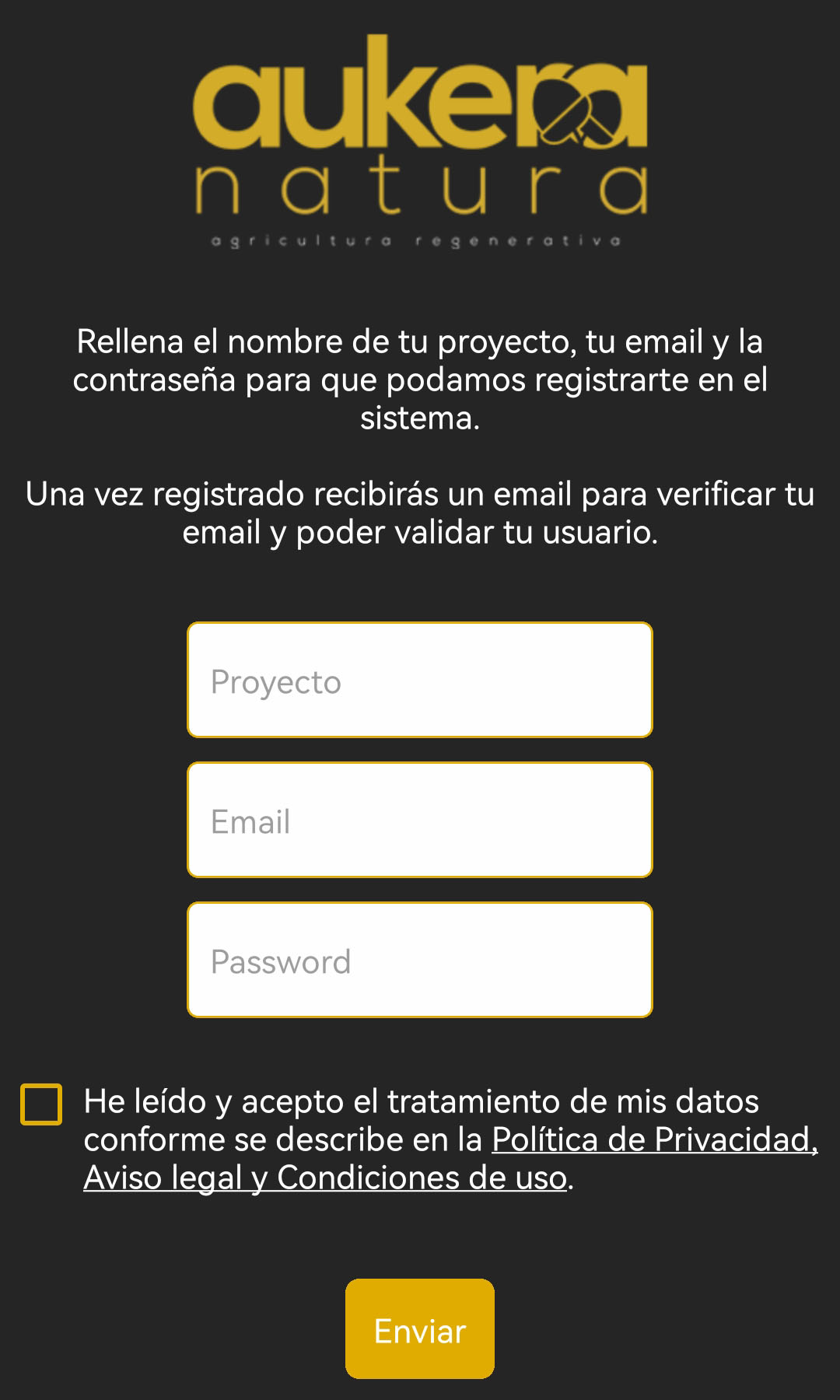 Cuando rellenes el nombre del proyecto, tu email y una contraseña te llegará un email para verificar tu cuenta. Una vez validado podrás empezar a utilizar la APP.